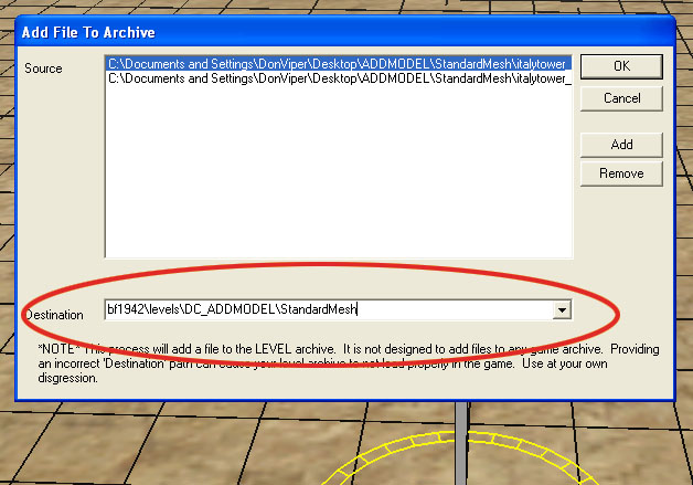 Click Add and browse to the ADDMODEL directory on your desktop, clicking through the Buildings and Common and Italytower_m1 directories so you see the Geometries.con, Objects.con and Italytower_m1.con files. Highlight all three and hit Open. In the Destination box, add this to the end of your map name: