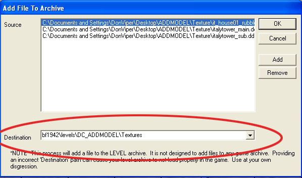 Click the Add button and browse again to the ADDMODEL directory on your desktop. Then to the Texture directory, where you will find the three texture files for this model. Highlight them all and click open. Then in the Destination box, you'll want to add this at the end of your map name: