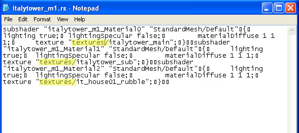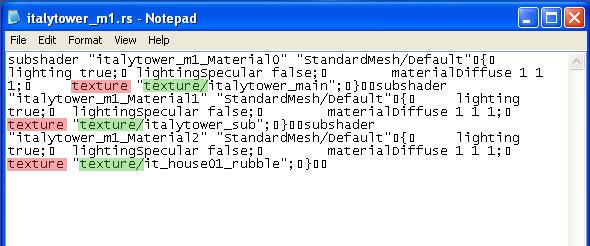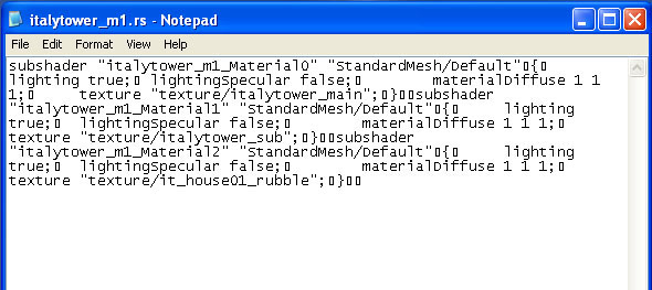 With NOTEPAD, open the Italytower_1m.rs file. Again, this is the file that contains the texture paths and coordinates. When you have it open, you'll see the information as posted in the above picture.