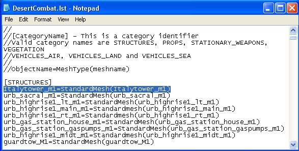 Now we have all the files extracted and have modified the texture paths in the Italytower_m1.rs file, we have also created the 2 extra objects.con and Italytower_m1.con files we'll be needing. It is time to get the model to show up in Battlecraft and the game.